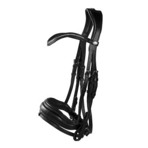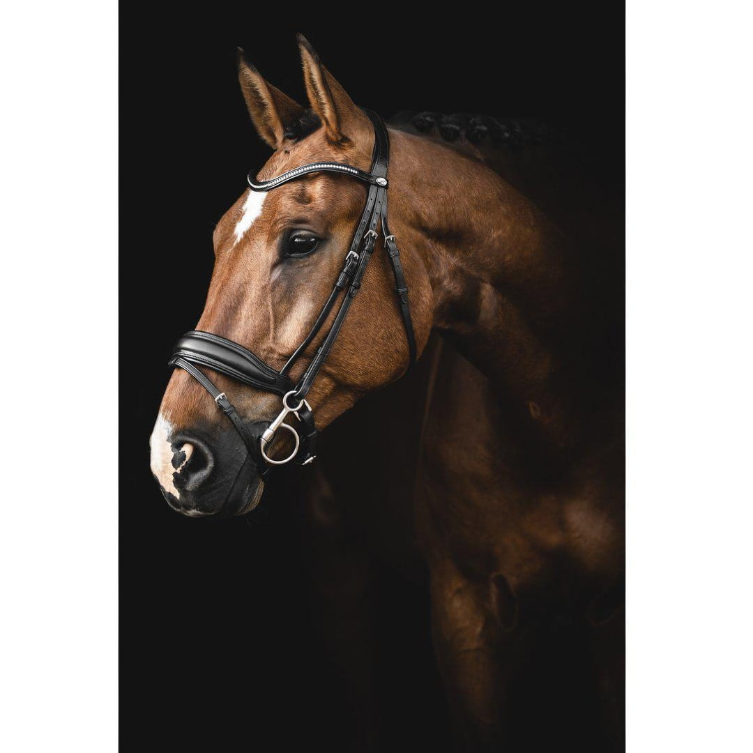 Lyxigt träns tillverkat i förstklassigt amerikanskt REACH-godkänt läder. Anatomisk mjukt fodrad nosgrimma och nackstycke. Levereras med två svängda pannband, ett med stenar och ett i slätt läder. Rostfria söljor.Storlek: Cob, full, x-full