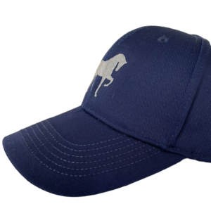Keps i bomull-/polyestermix med maskinbroderat hästmotiv. Att blanda polyester i bomullen gör tyget mer motståndskraftigt mot solljus, bleks alltså inte lika lätt. Ett vadderat svettband i mjuk mesh gör kepsen behaglig att bära. Silverringspänne i metall bak.