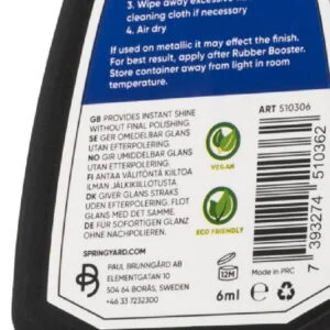 Omedelbar glans för gummistövlar och gummiprodukter. En miljöanpassad putssvamp speciellt utvecklad för att förhindra uttorkning och ge glans till produkter tillverkade i gummi, exempelvis gummistövlar och galoscher. Förlänger gummits livslängd och förhindrar att det krackelerar och spricker. För optimalt resultat, använd Springyard Gum Boot Shine i kombination med Rubber Booster.